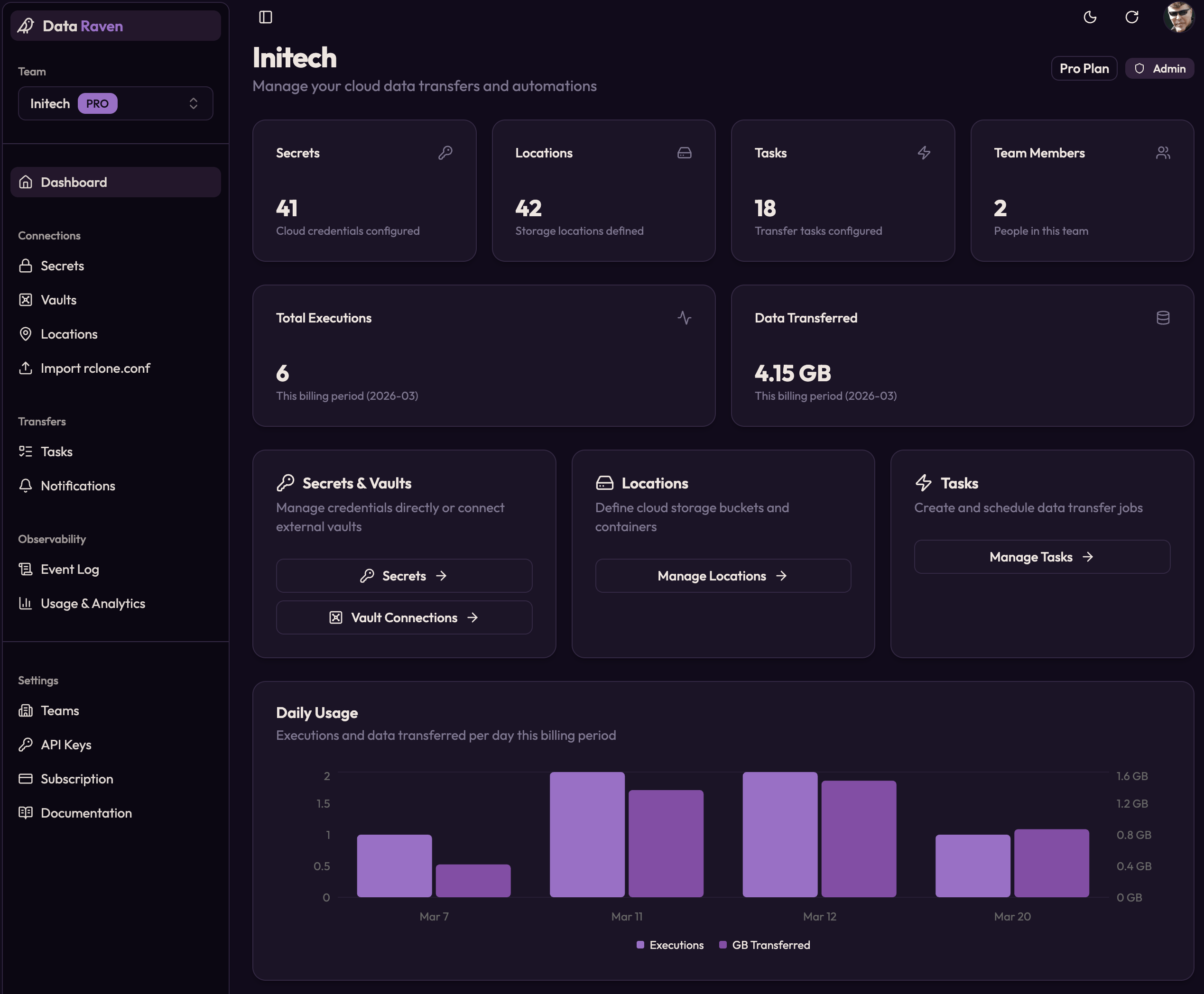Locations, secrets, tasks, and usage in one place instead of scattered across scripts and servers.
