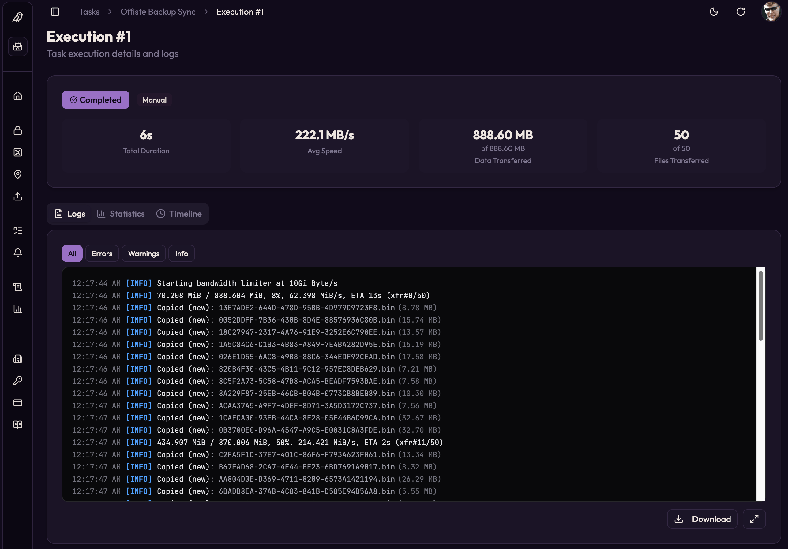 Review transfer duration, throughput, file counts, and raw logs in the same place the team already works.
